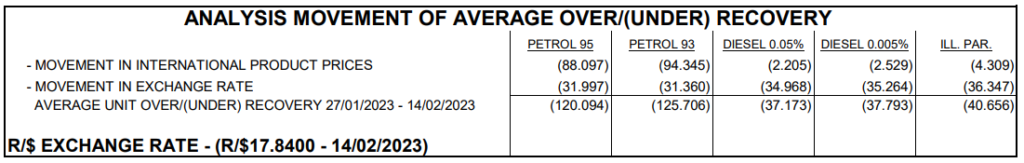 The rand’s weakness versus the dollar keeps pressure on local fuel costs, contributing to a worse under-recovery for diesel than for oil.